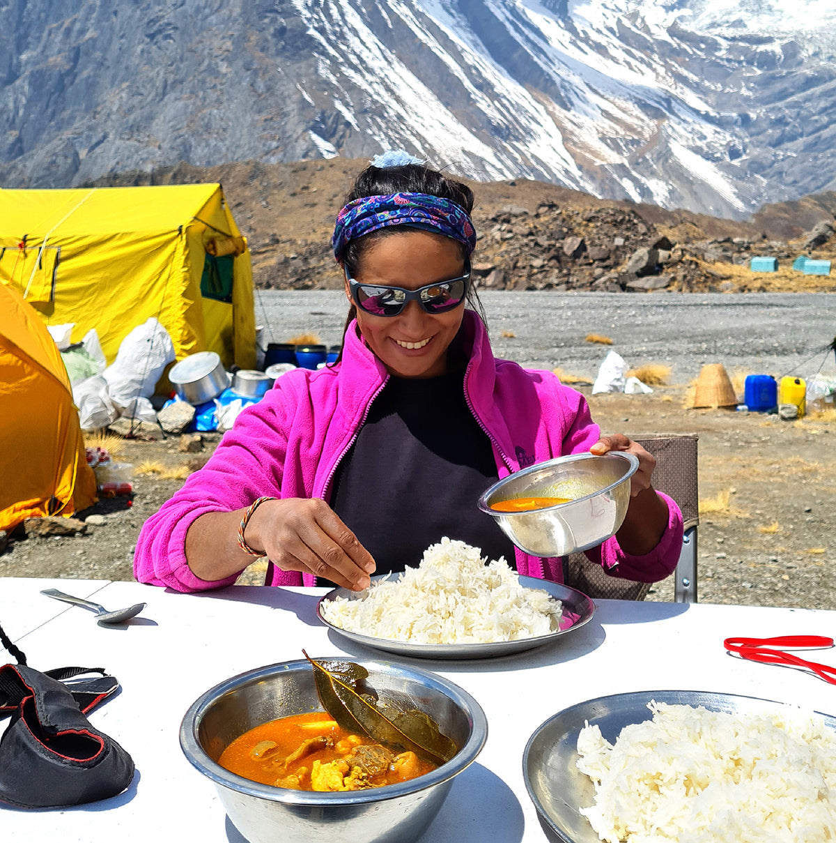 For mountains 8000m and above, called the ‘Death Zone’, oxygen tanks are vital. Each bottle weighs 4-5kg and we require on average 3-4 bottles per person. Other equipment needed are ice axes, ropes and crampons, in total a backpack can weigh around 25kg. Non-essential items or nice to have, are mobile phones and camera equipment which I only switch on to take photos and videos for a short amount of time as battery life suffers in extreme cold. If I ever forgot to take any one of the essential equipment items, my expedition would be cancelled as every item plays a role in my safety and literally could be the difference between life and death.”